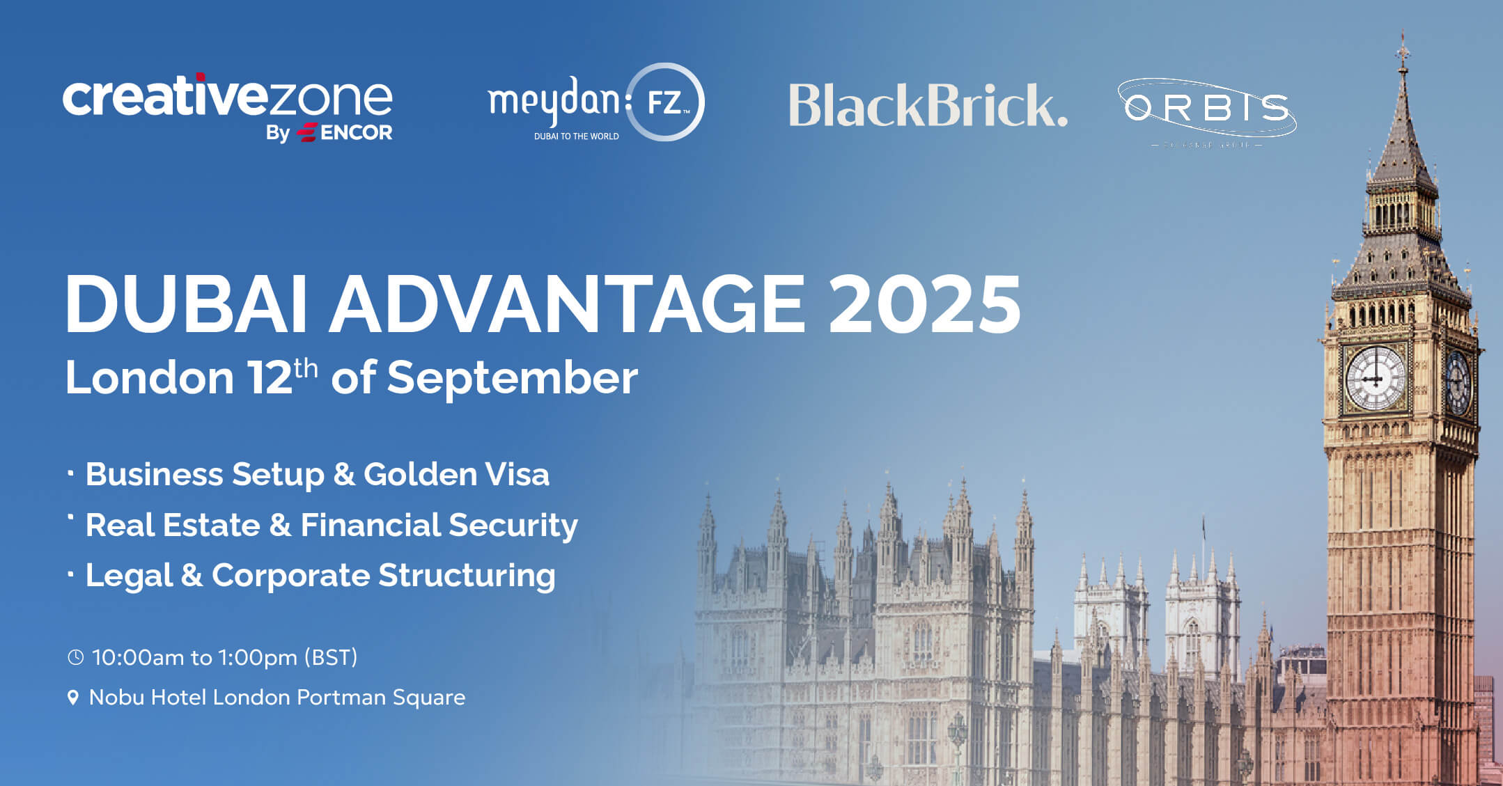 Join us on Friday 12th September at the Nobu Hotel London, Portman Square for an exclusive event hosted by Creative Zone, BlackBrick Property, Meydan Free Zone, and Orbis Exchange Group. Discover and explore the immense benefits of expanding your business into the UAE from Dubai based strategic professionals.